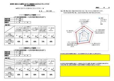 - 本エクセルファイルは、保育士・保育教諭の一人ひとりが自らの結果を記録するための様式です。『セルフチェックリスト』に記載の集計表および振り返りシートの結果を記録することに加え、1回目と2回目のチェックの結果を比較し、自らの保育の変化を振り返ることもできます。