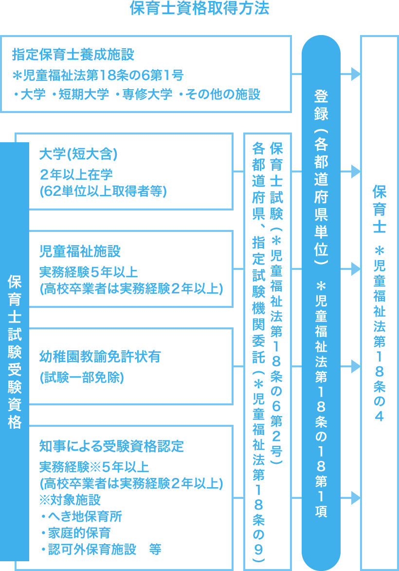 - 高等学校卒業後、大学・短期大学・専修学校などの保育士養成機関に入学し、所定の単位を取得して卒業する。